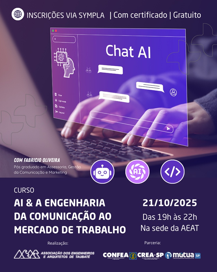 A AEAT convida seus associados e os profissionais da região para participar do curso “AI e a Engenharia – da Comunicação ao Mercado de Trabalho”, uma oportunidade única de compreender como a Inteligência Artificial está transformando a atuação dos profissionais de engenharia. [CLIQUE AQUI E INSCREVA-SE]