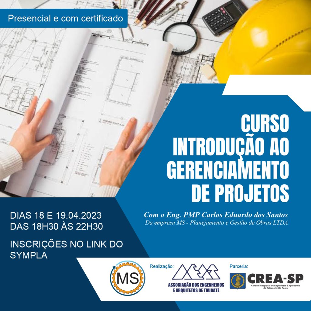 INSCRIÇÕES AQUI: Estão abertas as inscrições para o CURSO INTRODUÇÃO AO GERENCIAMENTO DE PROJETOS, que será ministrado de forma presencial na AEAT, dias 18 e 19 de abril de 2023, das 18h30 às 22h30, com carga horária de 8 horas. O curso será ministrado pelo Eng. PMP arlos Eduardo dos Santos, da empresa MS – Planejamento e Gestão de Obras LTDA.